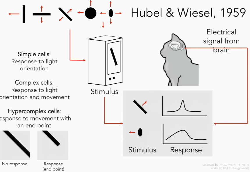 바로 컴퓨터 비전에도 영감을 준 1950/60년대 Hubel & Wiesel의 연구이며, 포유류의 시각적 처리 메커니즘을 밝히기 위해 고양이의 뇌를 연구한다.