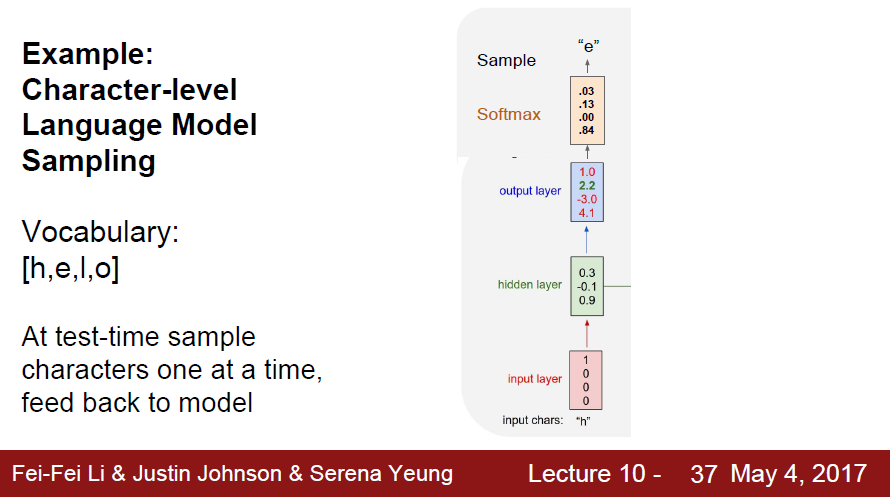 그러면 네트워크는 $y_t$를 출력하는데, 어떤 문자가 ‘h’ 다음에 나올 것 같은지를 예측한 값이다.