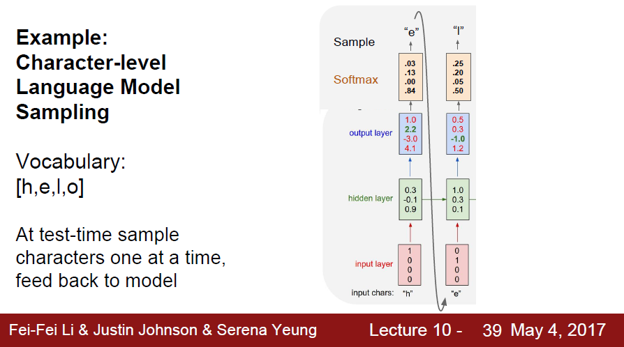 확률 분포에서 ‘e’가 나왔고, 이를 다음 스텝의 네트워크 입력으로 넣어준다.