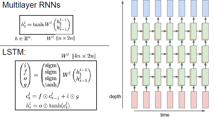 이런 식으로 RNN layer를 쌓아올릴 수 있다. 이렇게 하는 이유는 모델이 깊어질수록 다양한 문제들에서 성능이 더 좋아지기 때문이다.