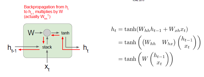 이는 매번 vanilla RNN cells를 하나 통과할 때마다 가중치 행렬의 일부를 곱하게 된다는 것을 의미한다.