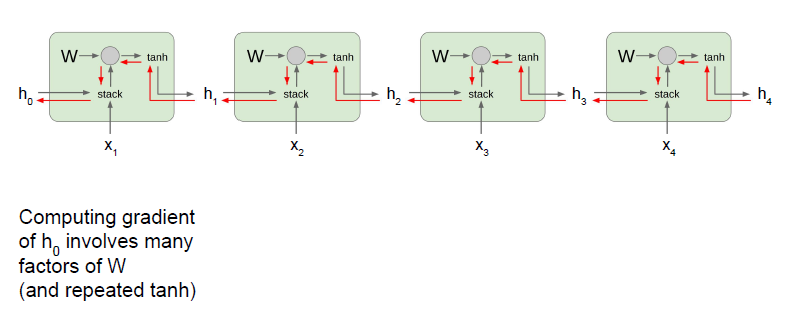 가령 우리가 $h_0$에 대한 gradient를 구하고자 한다면, 결국에는 모든 RNN cells를 거쳐야 한다.
