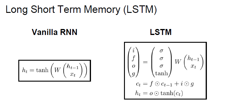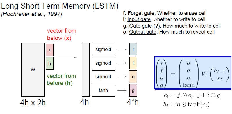 LSTM은 아주 재밌게 생겼다(?). Vanilla RNN은 hidden state가 있었고, 매 스텝마다 재귀적인 방법으로 hidden state를 업데이트 했다.