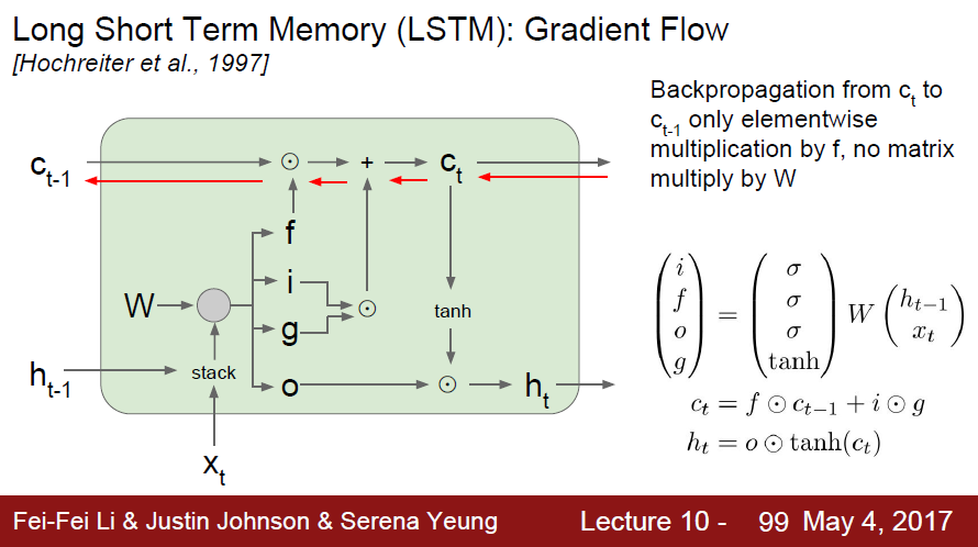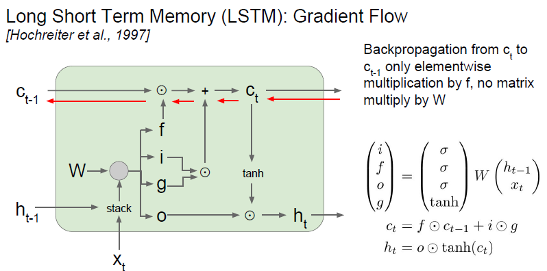 앞서 vanilla RNN의 경우에는 동일한 가중치 행렬 W만을 계속 곱했다. 이는 exploding/vanishing gradient 문제를 일으켰었는데, LSTM에서는 f가 스텝마다 계속 변한다.