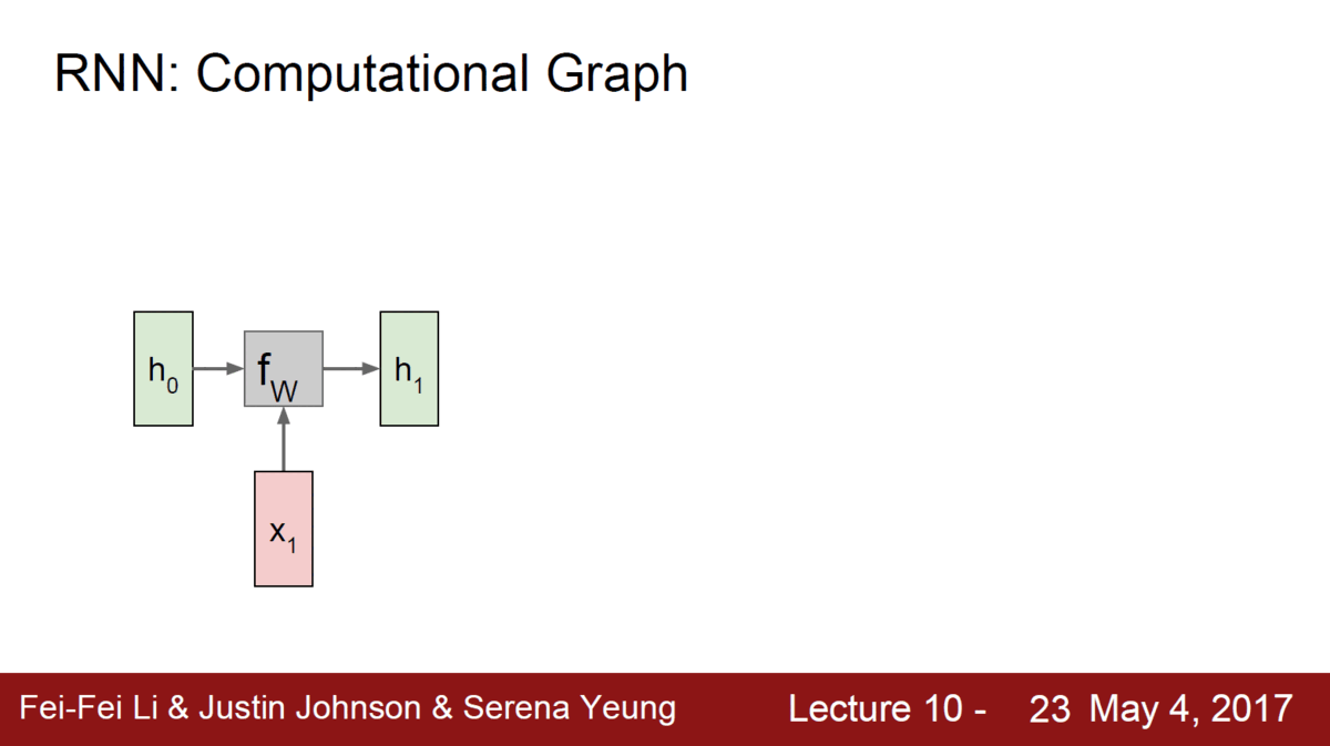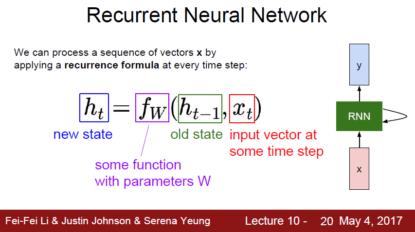 입력 $x$가 RNN으로 들어가면, RNN은 새로운 state vector를 만들어내기 위해 fixed function을 사용하여 input vector와 output vector를 결합한다.