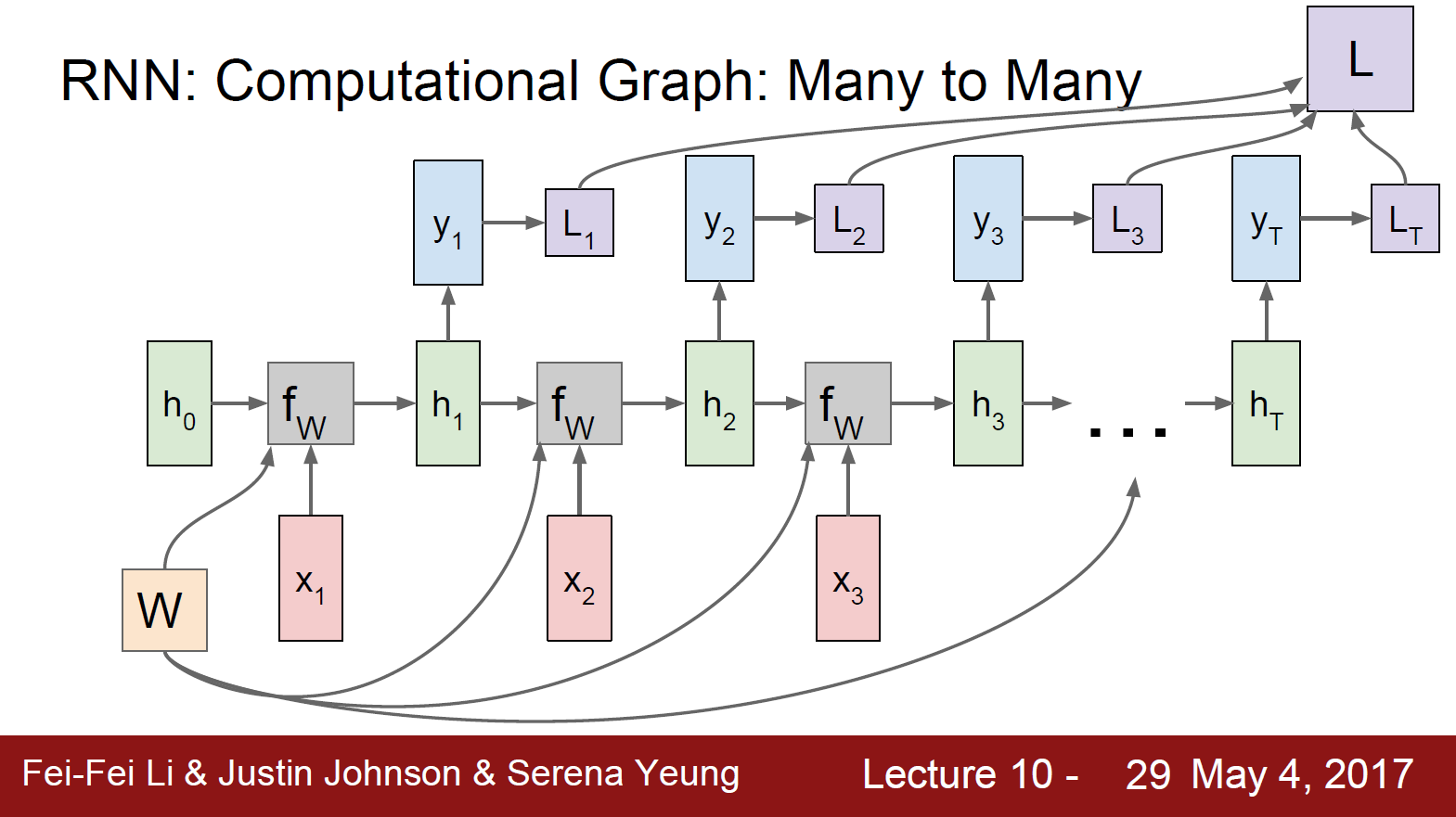 그래서 $y_t$는 매 스텝의 class score라 할 수 있다. 각 스텝마다 개별적으로 $y_t$에 대한 loss를 계산하고, RNN의 최종 loss는 각 개별 loss들의 합이 된다.