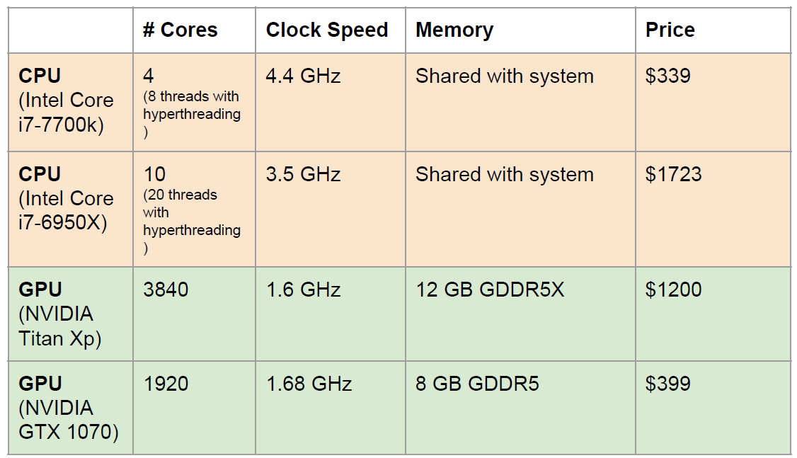 CPU는 더 높은 clock 속도를 가지지만, GPU는 더 많은 코어 수를 가지고 있고, 병렬 계산 처리에 있어서 더 뛰어난 성능을 보이기 때문에 딥러닝에 유리하다.