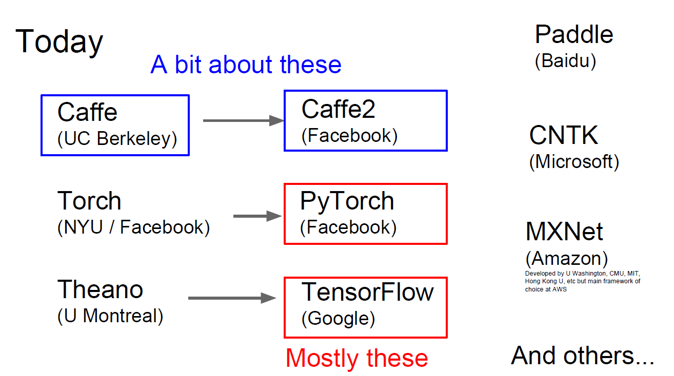 최근에 정말 수많은 딥러닝 프레임워크들이 나오고 있다. 해당 강의가 2017년 시점인 것을 고려하면, 현재는 더 많이 나왔을 것이다.
