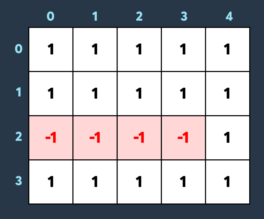 두 번째로 적이 맵의 (2,0)부터 (2,3)까지 공격하여 2만큼 건물의 내구도를 낮추면 아래와 같이 4개의 건물이 파괴되는 상태가 됩니다.