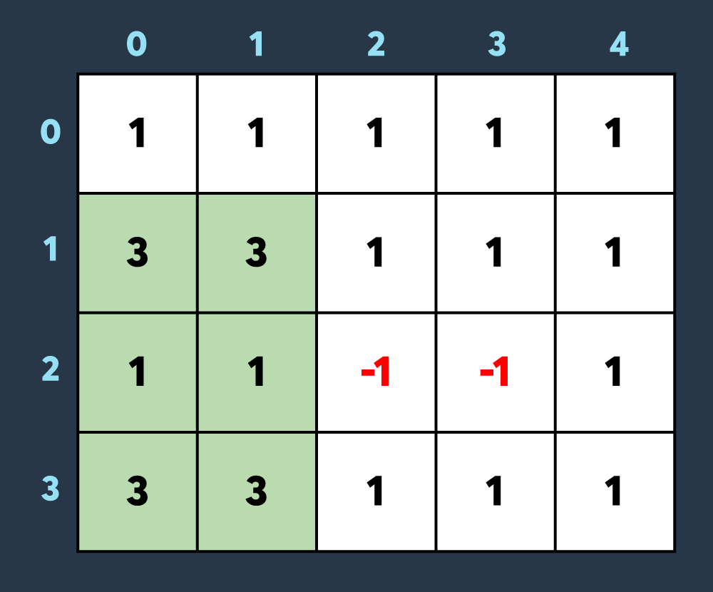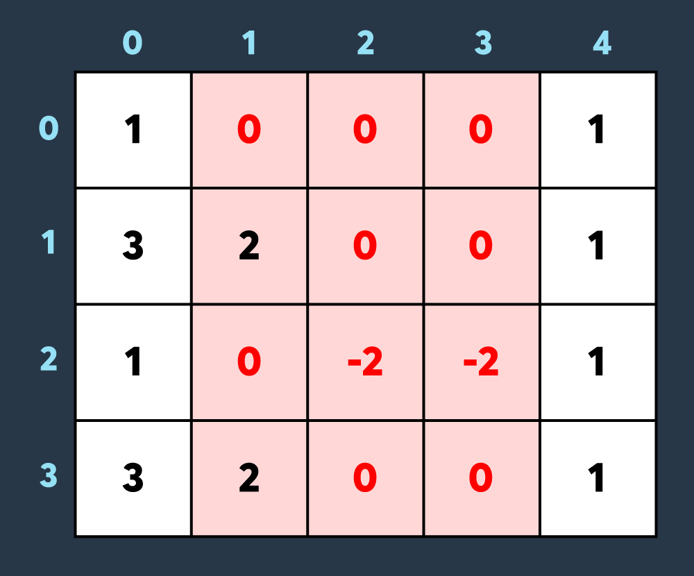 마지막으로 적이 맵의 (0,1)부터 (3,3)까지 공격하여 1만큼 건물의 내구도를 낮추면 아래와 같이 8개의 건물이 더 파괴되어 총 10개의 건물이 파괴된 상태가 됩니다. (내구도가 0 이하가 된 이미 파괴된 건물도, 공격을 받으면 계속해서 내구도가 하락하는 것에 유의해주세요.)